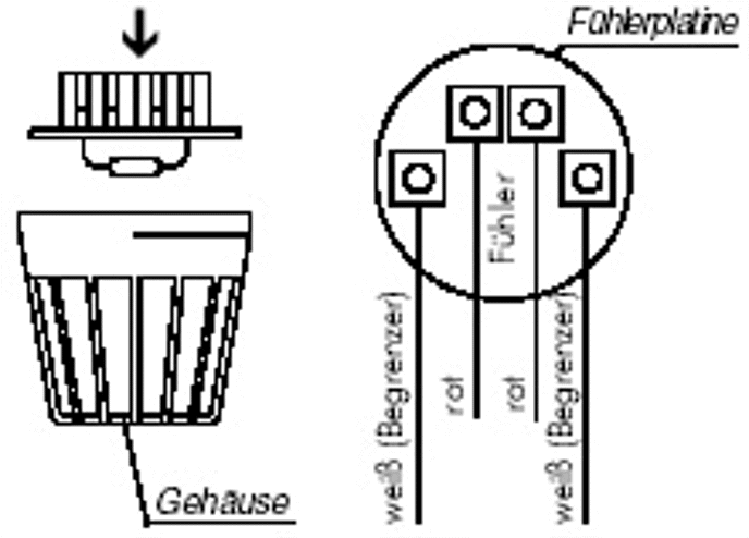 | 4. Die Leitungen für den Begrenzer (weiß) und den Temperaturfühler (rot) gemäß Abb. an der Fühlerplatine anklemmen: Die Fühlerplatine anschließend in das Gehäuse einrasten. | |||||