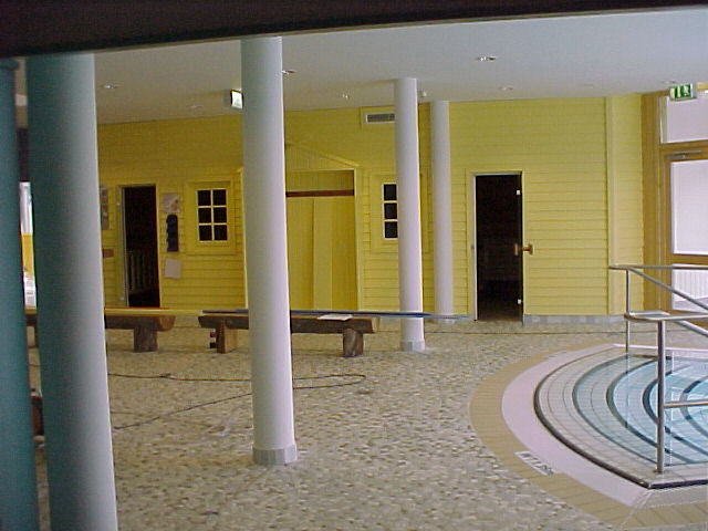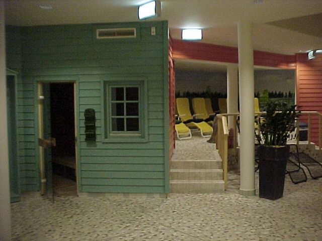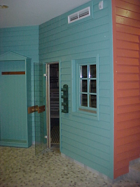Links 90° Sauna und rechts das Kolldarium. Außenverkleidung in gelber Farbe