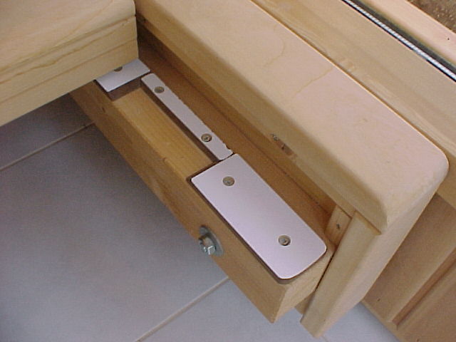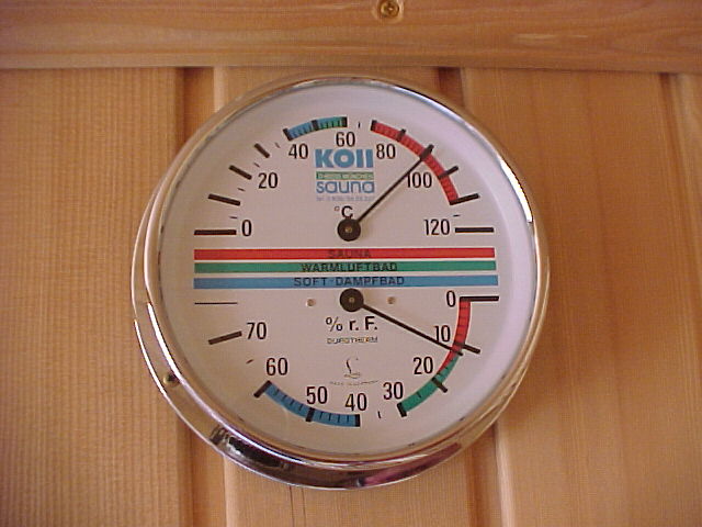Inneneinrichtung der Sauna, mit HPL Streifen versehen, zum leichten verschieben besonders bewährt.
