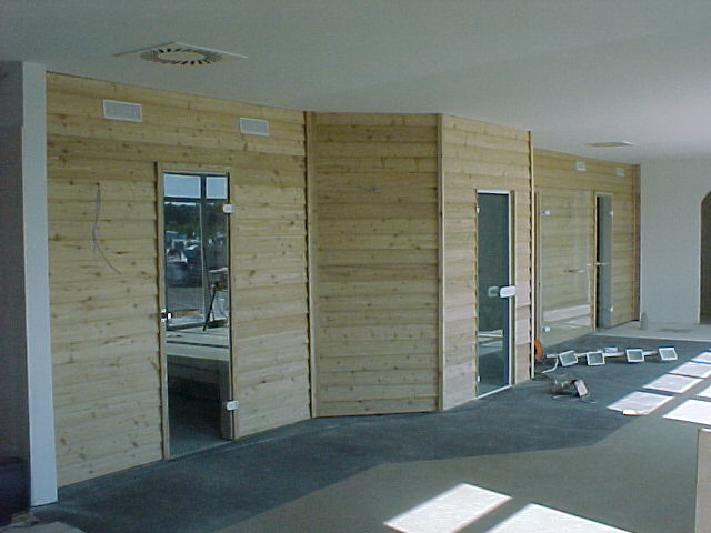 Außenansicht der Lärche Stülpschalung beim Dampfbad.