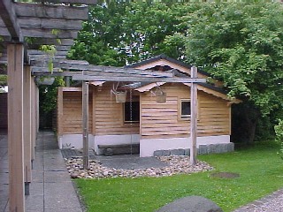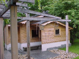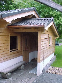 Links neben der Koll Profi Außensauna zusätzliche Garderobe für