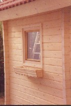 Detailaufnahme. Seitliches Fenster mit Blumenkasten.