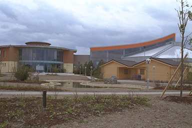 Ansicht der beiden Saunaanlagen im Vordergrund des Erlebnisbades "Waikiki" in Zeulenroda / Vogtland