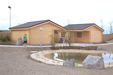 Ansicht der beiden gegenüberliegenden Saunaanlagen mit angelegten Teich.
