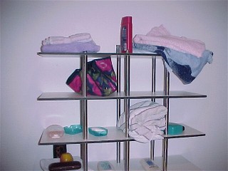 Regal als Ablage für Duschgel, Handtücher, Brillen im Duschbereich aus HPL Ablageböden mit Edelstahlrohren als Distanzhalter.