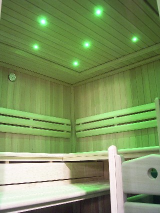Bild: Koll Exquisit Sauna auf der Heim und Handwerk im Herbst 2003 auf dem Münchener Messegelände. Sie sehen die LED Technik mit einer bei seit über 15 Jahren bewährten Glastechnik zur Übertragung des Lichtes in das Kabineninnere. Die LED Technik wird außerhalb der Kabine montiert, um die hohen Temperaturen von der LED Technik entfernt zu halten. Im Hintergrund sehen Sie ein indirektes Flächenheizsystem. |