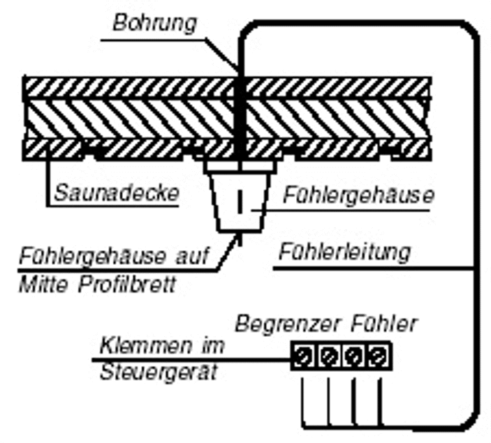 | 1. Der Ofenfühler wird in Kabinen bis zu der Größe von 2 x 2 m gemäß Abb. oben links montiert, in größeren Kabinen gemäß Abb. oben rechts montiert. | |||||