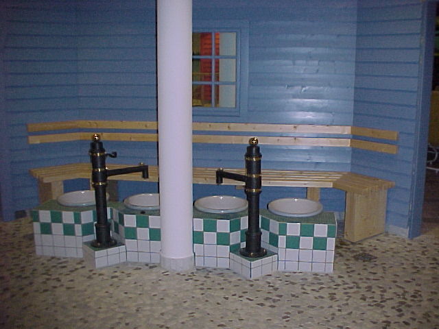 Wand mit Stülpschalung in blau mit Fensterattrappe (Spiegelglas), Fußbadebecken und Sitzbank