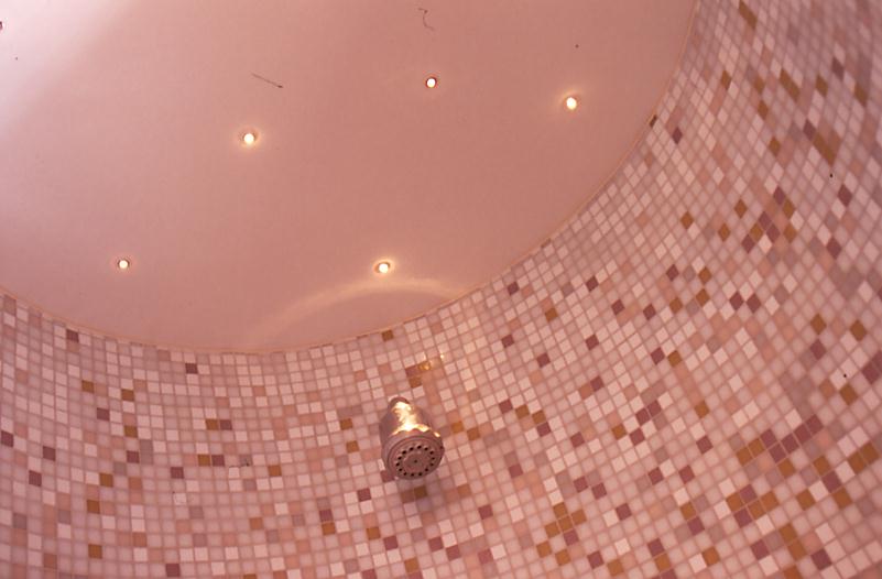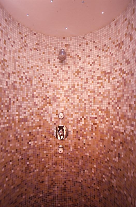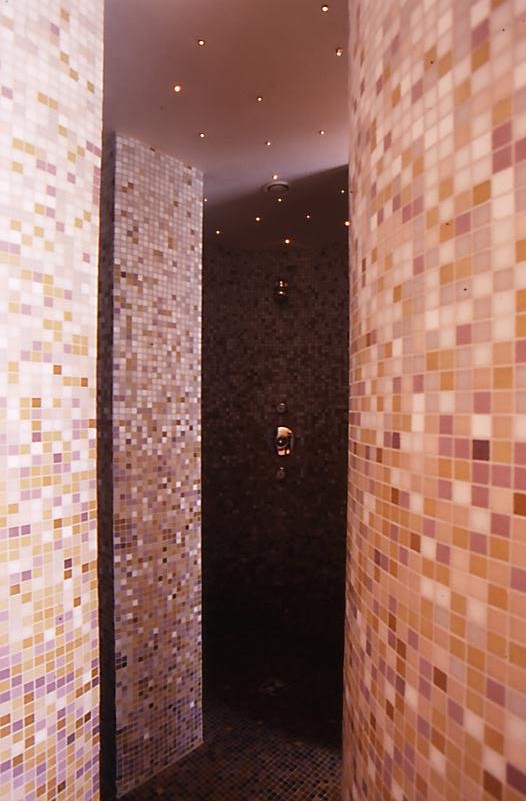 Eingangsbereich der Erlebnisduschen. Fliesen Glasmosaik im Farbverlauf (unten dunkler noch oben hell werdend)