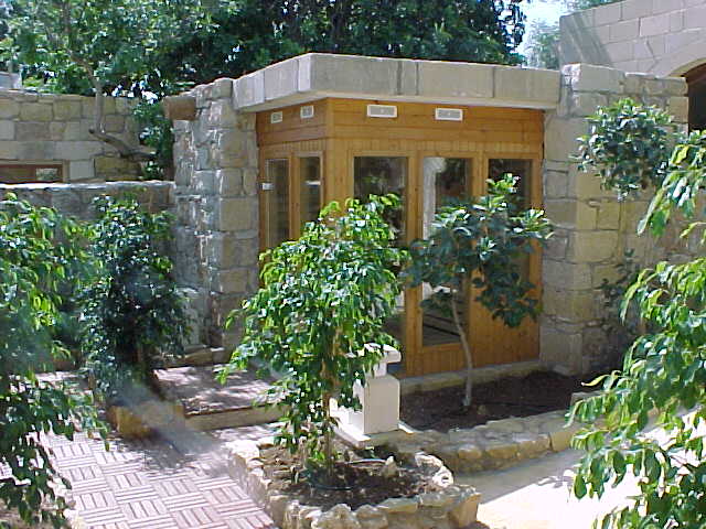 Außensauna eingemauert bis auf kleine Ecke für Tür und Fensterscheiben