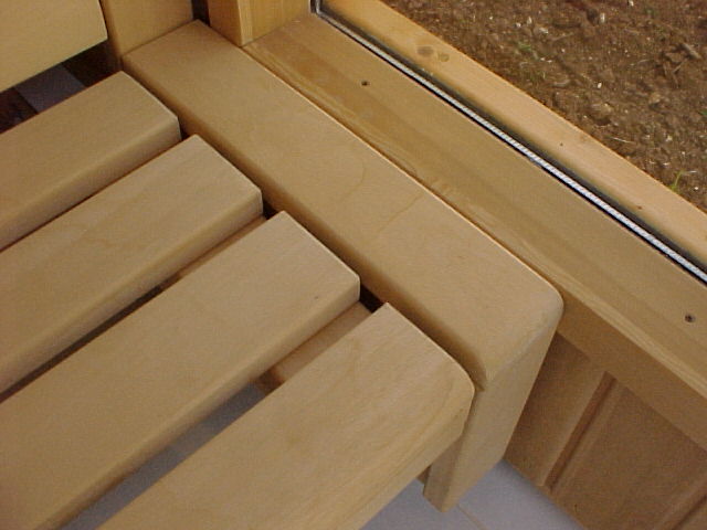 Inneneinrichtung der Sauna, mit HPL Streifen versehen, zum leichten verschieben besonders bewährt.